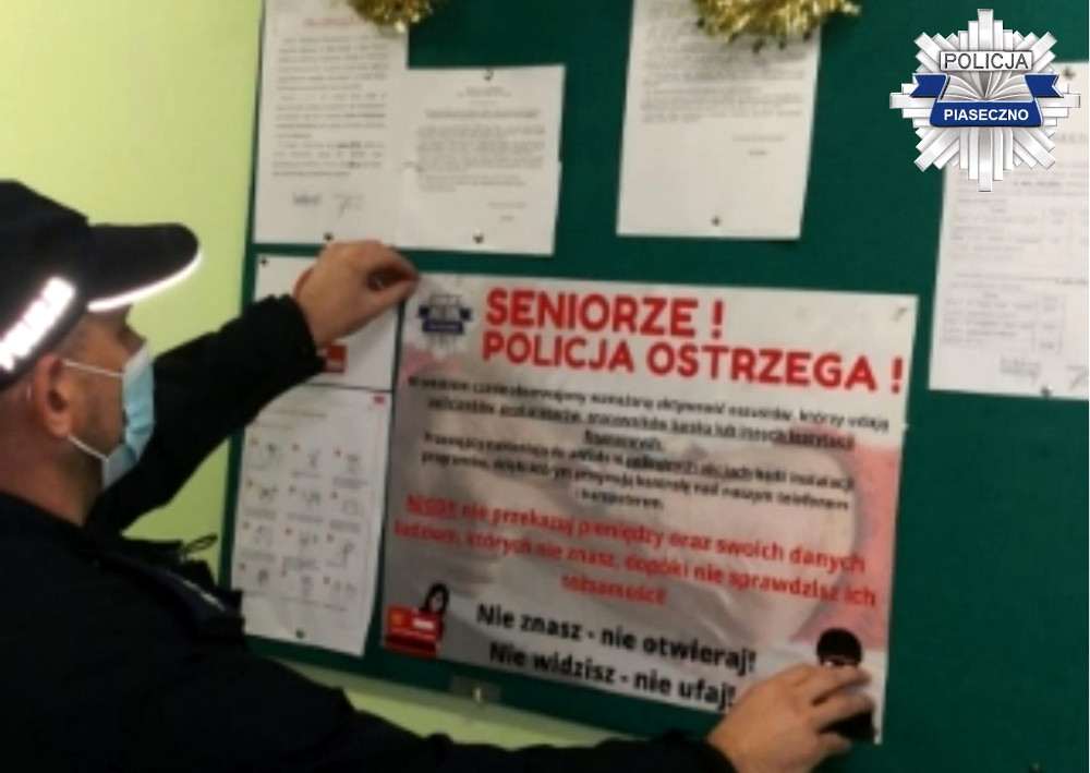 Okres przedświąteczny jest czasem szczególnym. Wielu osobom towarzyszy pośpiech i roztargnienie. Jest to niestety również czas wytężonej pracy oszustów. Wspólnie zadbajmy o to, by uniknąć stania się ofiarą przestępstwa. Ruszyła przedświąteczna kampania piaseczyńskiej policji oraz starostwa powiatowego w Piasecznie. Dzielnicowi dokonując kolportażu plakatów z ostrzeżeniami w placówkach handlowo - usługowych chcą dotrzeć do jak największej liczby seniorów.