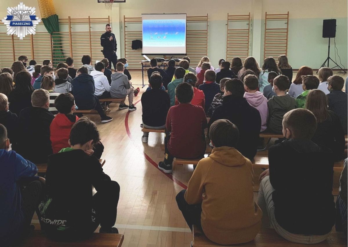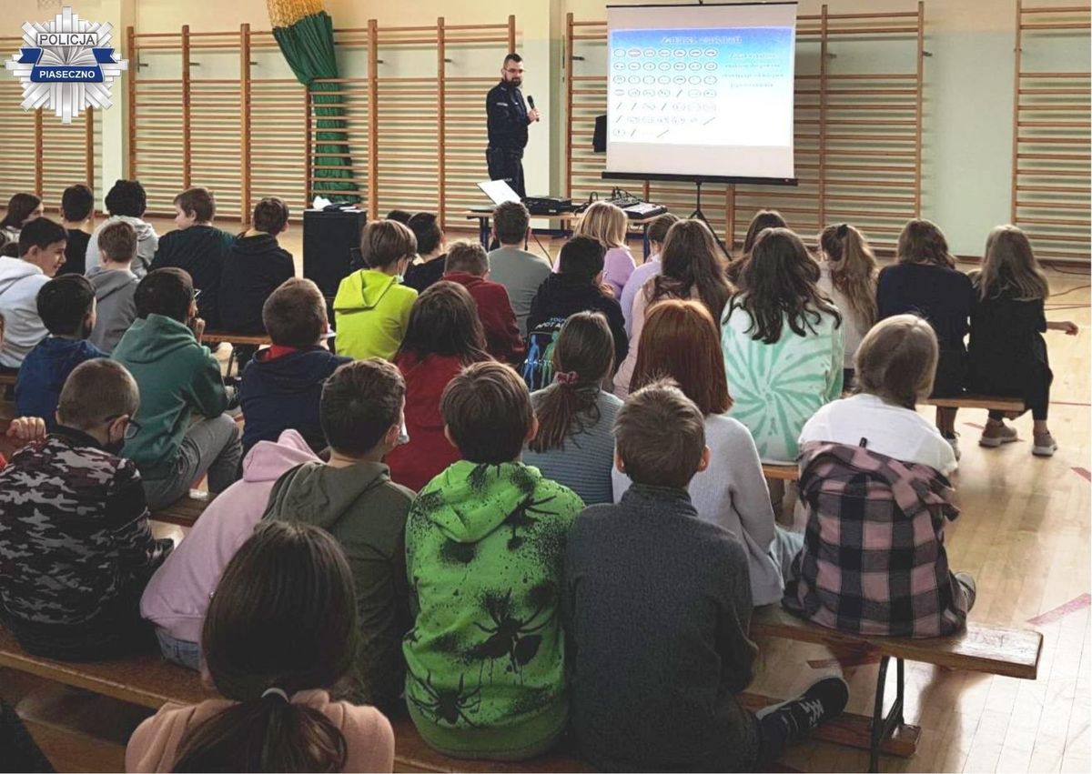 Każde spotkanie z policjantem jest dobrą okazją do pogłębienia swojej wiedzy. Wczoraj mogli się o tym przekonać uczniowie Szkoły Podstawowej nr 1 w Górze Kalwarii. Dzieci w trakcie prelekcji dowiedziały się jak dbać o bezpieczeństwo swoje i innych uczestników ruchu drogowego, zarówno podczas przemieszczania się rowerem, jak i pieszo. Policjant opowiedział, jak ważną rolę odgrywają elementy odblaskowe umieszczone na odzieży wierzchniej. Nie zabrakło również wiedzy na temat tego w jakie elementy powinien być wyposażony każdy rower oraz jak ważną rolę odgrywa kask ochronny. Spotkanie to było świetną okazją do powtórzenia materiału przed zbliżającym się egzaminem na kartę rowerową. Jak na każdym takim wydarzeniu nie zabrakło również pytań oraz dzielenia się swoimi doświadczeniami.