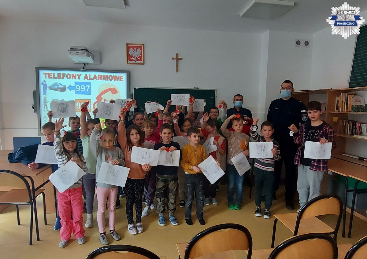 Dzielnicowy mł. asp. Mariusz Latek wraz z piaseczyńskim profilaktykiem społecznym odwiedzili Szkołę Podstawową im. M. Karczyńskiego w Pracach Małych. Spotkali się z uczniami wszystkich klas.
