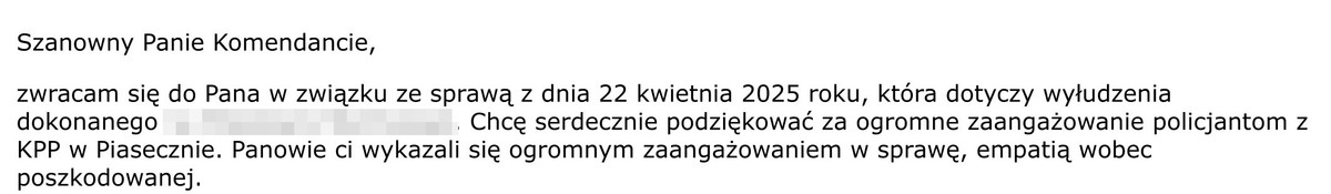 Policjanci przyjęli zawiadomienie od pokrzywdzonej, ale przede wszystkim dołożyli wszelkich starań, by otoczyć starszą kobietę troską i zapewnić jej poczucie bezpieczeństwa w tej stresującej dla niej sytuacji. Kilka dni po zdarzeniu do komendy wpłynął e-mail z podziękowaniami od członka rodziny seniorki. W poruszających słowach wyraził on wdzięczność za zaangażowanie, profesjonalizm i empatię policjantów. Te słowa są dla funkcjonariuszy nie tylko wyrazem uznania, ale przede wszystkim motywacją do dalszego działania i niesienia pomocy tym, którzy jej najbardziej potrzebują.