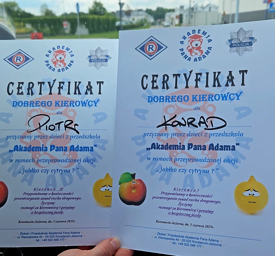 Wczoraj policjanci piaseczyńsiej drogówki wspólnie z przedszkolakami z "Akademii Pana Adama" na terenie Konstancina - Jeziorny przeprowadzili akcję "Jabłuszko czy cytrynka". Mundurowi czujnym okiem obserwowali zachowania kierujących. Tych wzorowych i przepisowych najmłodsi nagradzali soczystymi jabłkami oraz dyplomami, a także dziecięcym uśmiechem, który jest najlepszą formą podziękowania. Kierujących, co do których zachowań na drodze funkcjonariusze mieli pewne zastrzeżenia przedszkolaki częstowały kwaśną cytryną, którą nie tylko trzeba było wycisnąć ale w ramach "kary" wypić sok.