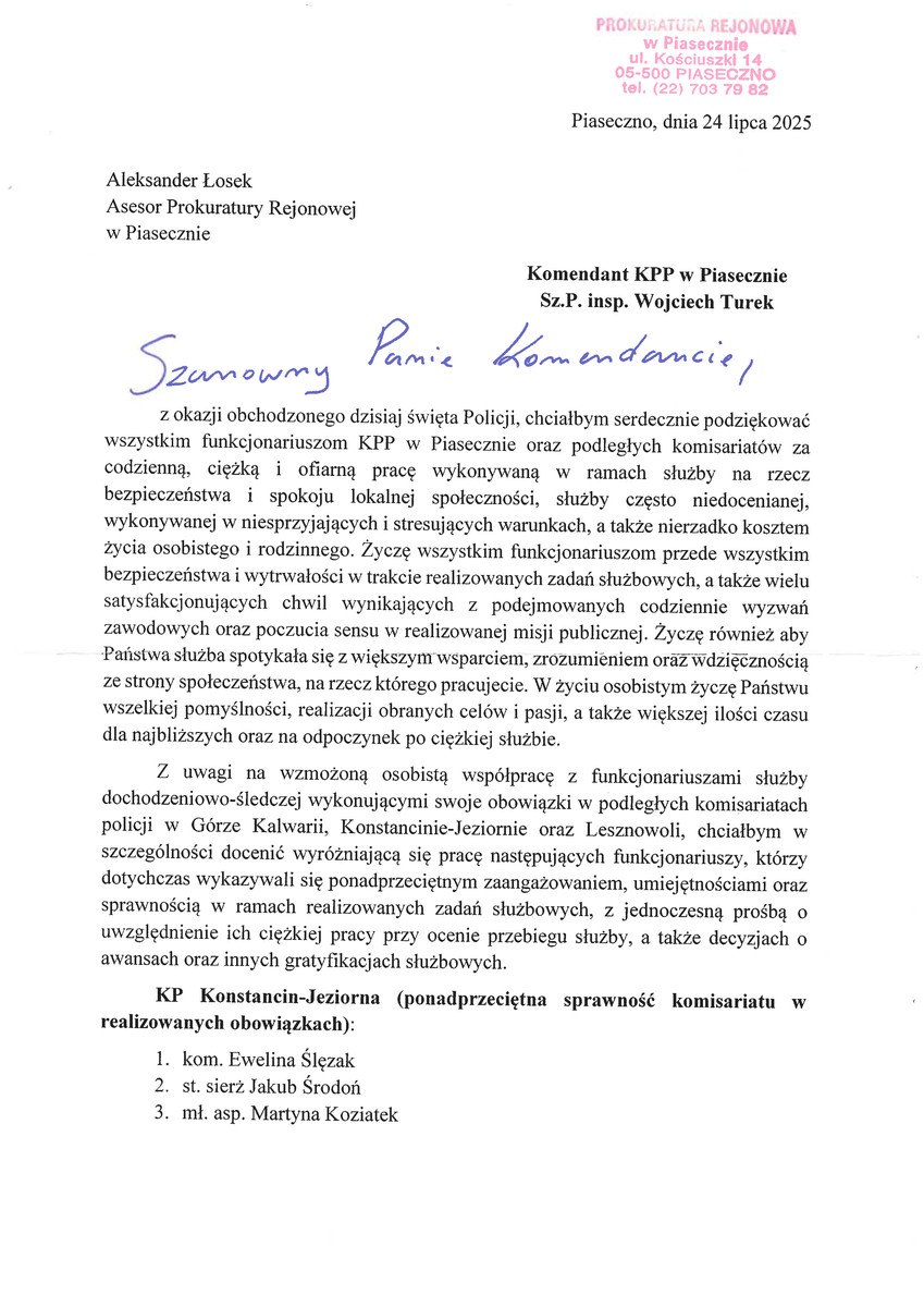 Na ręce Komendanta Powiatowego Policji w Piasecznie insp. Wojciecha Turka wpłynęły serdeczne podziękowania i życzenia od asesora Aleksandra Łoska z Prokuratury Rejonowej w Piasecznie z okazji Święta Policji. Ten gest jest wyrazem uznania dla codziennej, odpowiedzialnej służby funkcjonariuszy oraz symbolem solidarności i wzajemnego szacunku między instytucjami stojącymi na straży prawa i porządku publicznego.