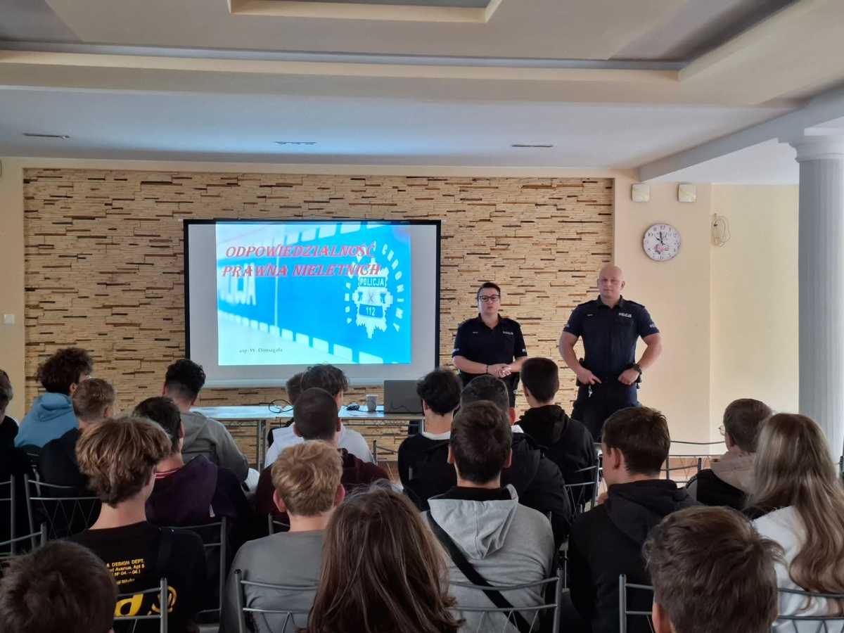 Dzielnicowy i profilaktyk z wizytą w szkole ponadpodstawowej