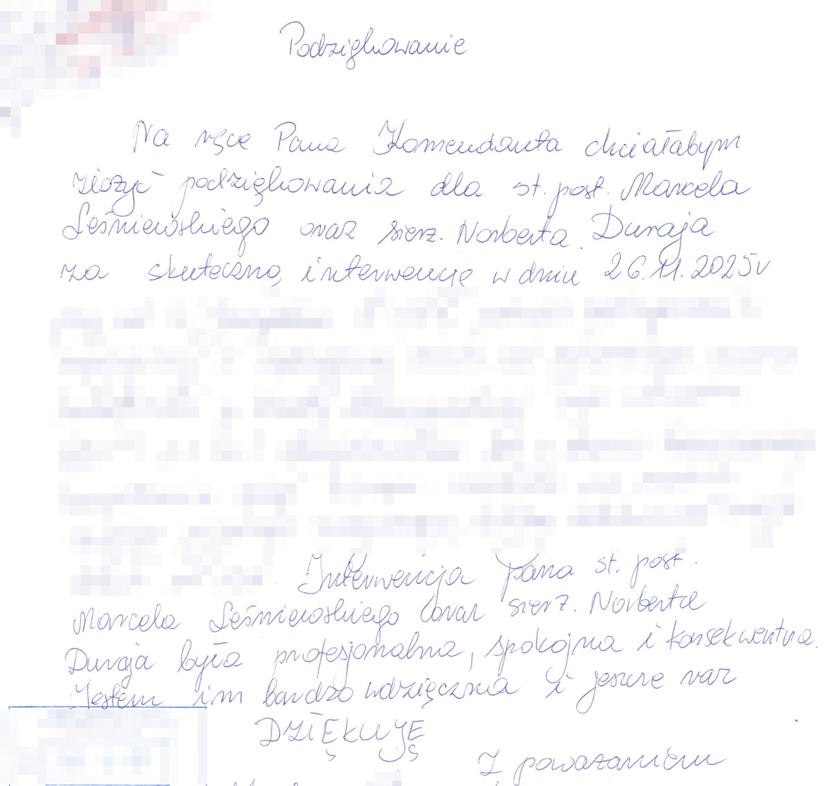 Na ręce Komendanta Powiatowego Policji w Piasecznie insp. Wojciecha Turka wpłynęły ciepłe i pełne uznania podziękowania od mieszkanki, która dzięki profesjonalnej interwencji funkcjonariuszy odzyskała poczucie bezpieczeństwa. Choć funkcjonariusze nie oczekują wdzięczności za wykonywaną pracę, takie podziękowania są bez wątpienia miłe i stanowią dodatkową motywację do dalszej służby na rzecz mieszkańców powiatu piaseczyńskiego.