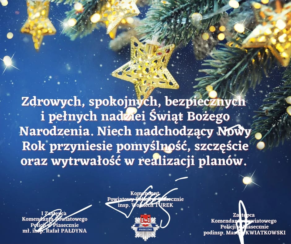 Z okazji zbliżających się Świąt Bożego Narodzenia Komendant Powiatowy Policji w Piasecznie insp. Wojciech Turek wraz z Zastępcami, składają serdeczne życzenia policjantom, policjantkom oraz pracownikom cywilnym piaseczyńskiej jednostki, ich najbliższym oraz wszystkim mieszkańcom powiatu piaseczyńskiego. Niech te święta będą bezpieczne i zdrowe, a nadchodzący Nowy Rok obfituje w pozytywne zdarzenia i wszelką pomyślność. Wesołych Świąt!