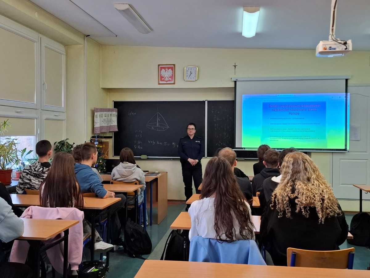 W trakcie całego roku szkolnego funkcjonariusze prowadzą spotkania w placówkach oświatowych na terenie całego naszego powiatu. W ostatnim czasie taka prelekcja odbyła się w Zespole Szkół Ogólnokształących przy ul. ks. Sajny 16 w Górze Kalwarii.