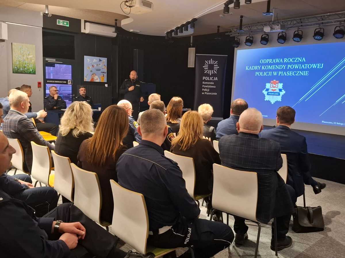 Wczoraj w Centrum Edukacyjno-Multimedialnym w Piasecznie odbyła się odprawa służbowa funkcjonariuszy Komendy Powiatowej Policji w Piasecznie, podsumowująca działania podejmowane na terenie powiatu w minionym roku. Spotkanie zgromadziło kadrę kierowniczą jednostki, funkcjonariuszy, pracowników cywilnych oraz zaproszonych gości reprezentujących władze samorządowe i współpracujące instytucje.