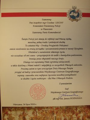 Na zakończenie uroczystości, Komendant Powiatowy Policji w Piasecznie insp. Czesław Leicht i zaproszeni goście, złożyli życzenia pracownikom policji i ich rodzinom, życząc wszystkim sukcesów w pracy zawodowej i życiu osobistym.
