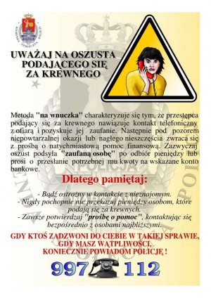 W związku z licznymi, powtarzającymi się w całym kraju przypadkami oszustw, których ofiarami stają się starsze osoby, samotnie mieszkające i łatwowiernie odnoszące się do nieznajomych, policjanci apelują o ostrożność i zdrowy rozsądek. Szczególną rozwagą należy wykazać się w kontaktach z osobami pukającymi do mieszkań i domów, a także podczas rozmów telefonicznych z rzekomym wnuczkiem czy innym krewnym. Zachowując podstawowe zasady bezpieczeństwa można ustrzec się poważnych strat finansowych, a także pomóc w zatrzymaniu przestępców.