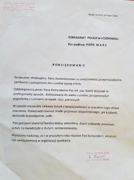 Dzielnicowi sprawdzili też wiedzę uczniów ze znajomości numerów alarmowych. Dyrekcje obu szkół za profesjonalne przeprowadzenie tych spotkań, złożyły na ręce komendanta Komisariatu w Lesznowoli podinspektora Piotra Warsa okolicznościowe podziękowania.