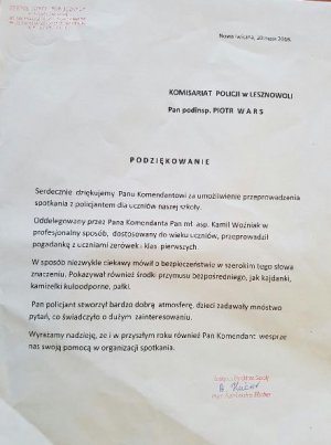 Podziękowania za przeprowadzone prelekcje dla dzielnicowych z Lesznowoli